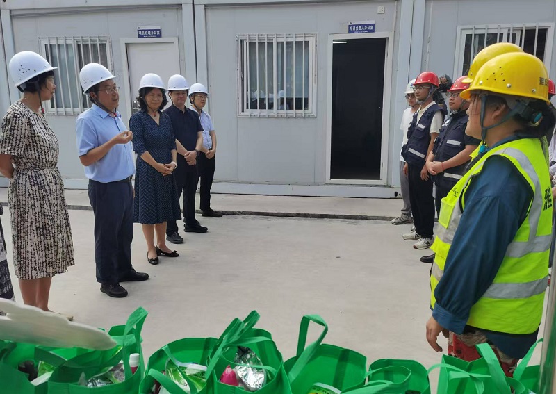 慰問組一行深入項目施工現(xiàn)場,詳細了解了項目的通風降溫設施、防暑藥品配備、清涼飲品供應、工人作息時間調整等關鍵防暑措施落實情況,對施工現(xiàn)場的安全防護設施進行了檢查。