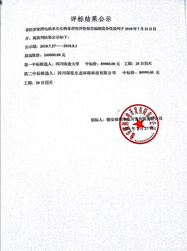 滎經(jīng)羅家灣電站水生生物多樣性評(píng)價(jià)報(bào)告編制競爭性談判評(píng)標(biāo)結(jié)果公示