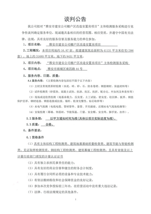 雅安市建安公司棚改區(qū)改造安置房項(xiàng)目主體檢測(cè)服務(wù)競(jìng)爭(zhēng)性談判公告