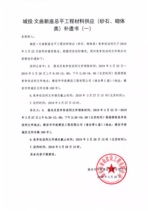 城投·文曲新座總平工程材料供應(yīng)(砂石、砌體類)競爭性談判公告補(bǔ)遺一