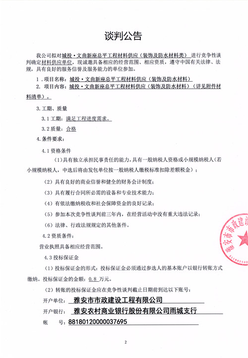 城投·文曲新座總平工程材料供應(yīng)(裝飾及防水材料類(lèi))競(jìng)爭(zhēng)性談判公告