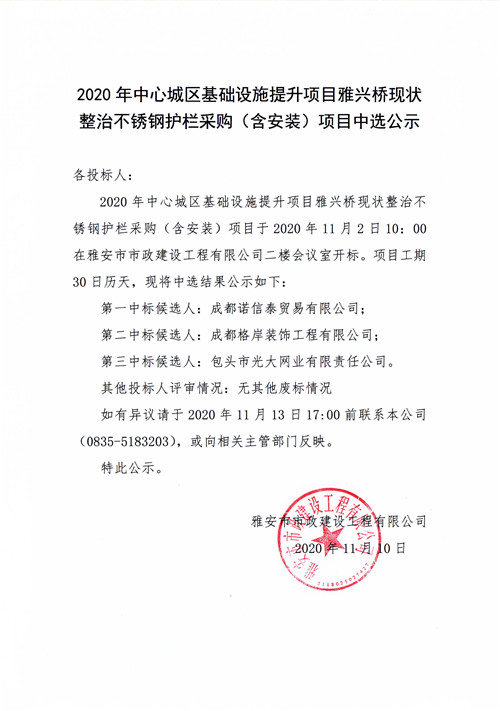 2020年中心城區(qū)基礎(chǔ)設(shè)施提升項(xiàng)目雅興橋現(xiàn)狀整治不銹鋼護(hù)欄采購(含安裝)項(xiàng)目中選公示