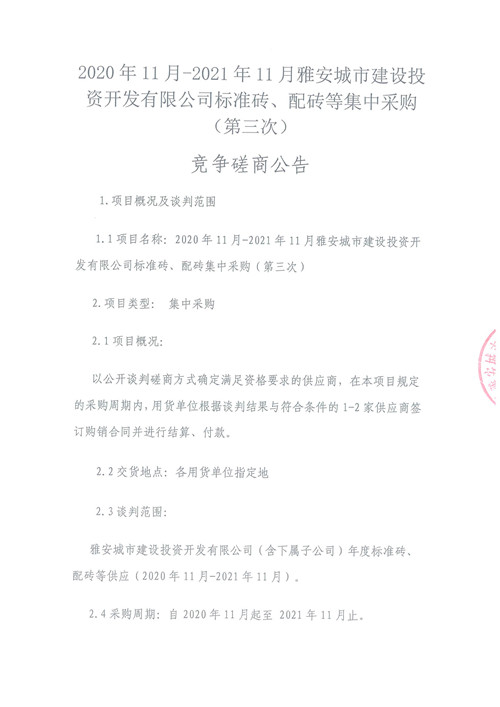 2020年11月-2021年11月雅安城市建設(shè)投資開發(fā)有限公司標(biāo)準(zhǔn)磚、配磚等集中采購(第三次)競爭磋商公告