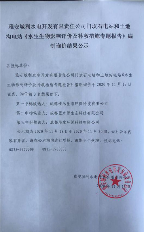 城利水電公司門坎石電站和土地溝電站《水生生物影響評(píng)價(jià)及補(bǔ)救措施專題報(bào)告》編制詢價(jià)結(jié)果公示