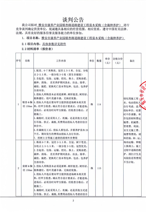 雅安市康養(yǎng)產(chǎn)業(yè)園銀杏路道路建設(shè)工程苗木采購(gòu)(含栽種養(yǎng)護(hù))談判公告