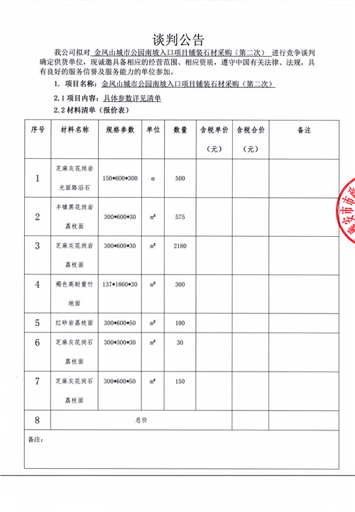 金鳳山城市公園南坡入口項(xiàng)目鋪裝石材采購(第二次)競(jìng)爭(zhēng)性談判公告