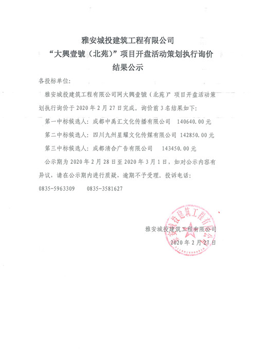 城投建工“大興壹號(北苑)”項目開盤活動策劃執(zhí)行詢價結(jié)果公示