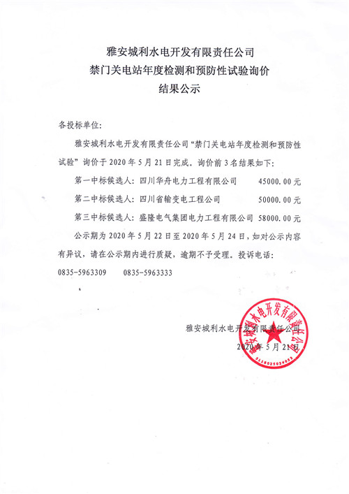 城利水電公司禁門關(guān)電站年度檢測(cè)和預(yù)防性試驗(yàn)詢價(jià)結(jié)果公示