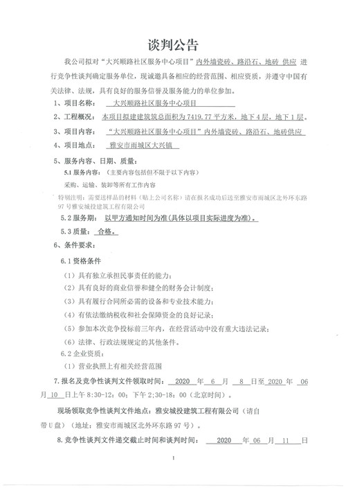城投建工公司“大興順路社區(qū)服務(wù)中心項目”內(nèi)外墻瓷磚、路沿石、地磚供應(yīng)競爭性談判公告(第二次)