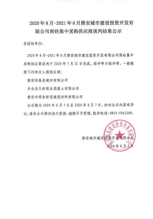 2020年8月-2021年8月雅安城市建設(shè)投資開發(fā)有限公司商砼集中采購(gòu)供應(yīng)商談判結(jié)果公示
