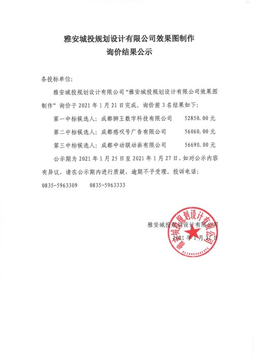 雅安城投規(guī)劃設(shè)計(jì)有限公司效果圖制作詢價(jià)結(jié)果公示