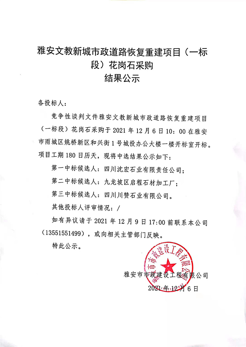 雅安文教新城市政道路恢復(fù)重建項(xiàng)目(一標(biāo)段)花崗石采購結(jié)果公示