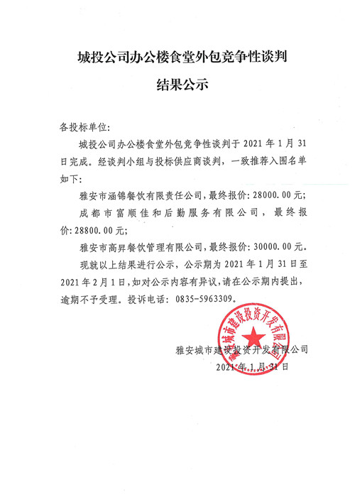 城投公司辦公樓食堂外包競(jìng)爭(zhēng)性談判結(jié)果公示