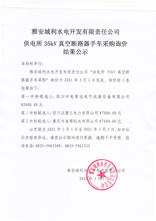 城利水電公司供電所35kV真空斷路器手車采購詢價結(jié)果公示