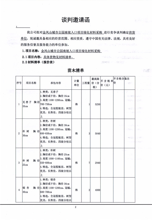 金鳳山城市公園南坡入口項(xiàng)目綠化材料采購談判邀請函