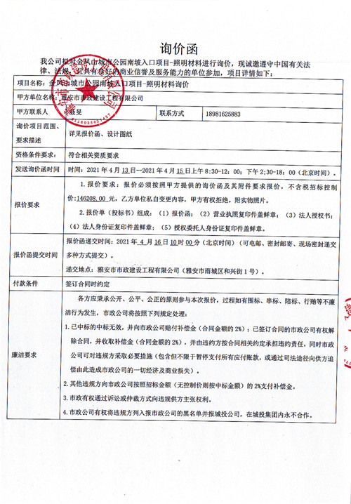 雅安市政公司金鳳山公園南坡入口項(xiàng)目-照明材料詢價(jià)函