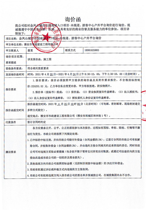 金鳳山城市公園南坡入口項(xiàng)目-木棧道、游客中心戶外平臺(tái)詢價(jià)函