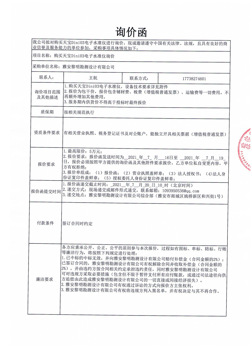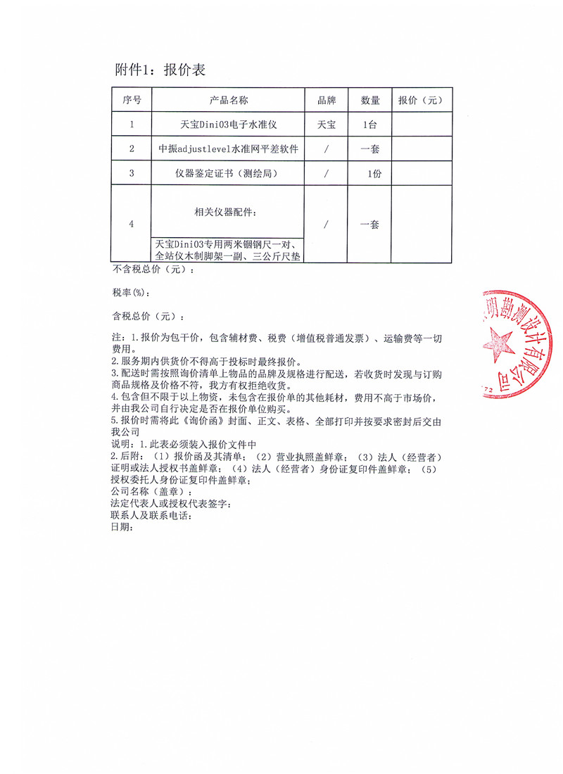 黎明勘測公司關(guān)于購買天寶Dini03電子水準儀的詢價函