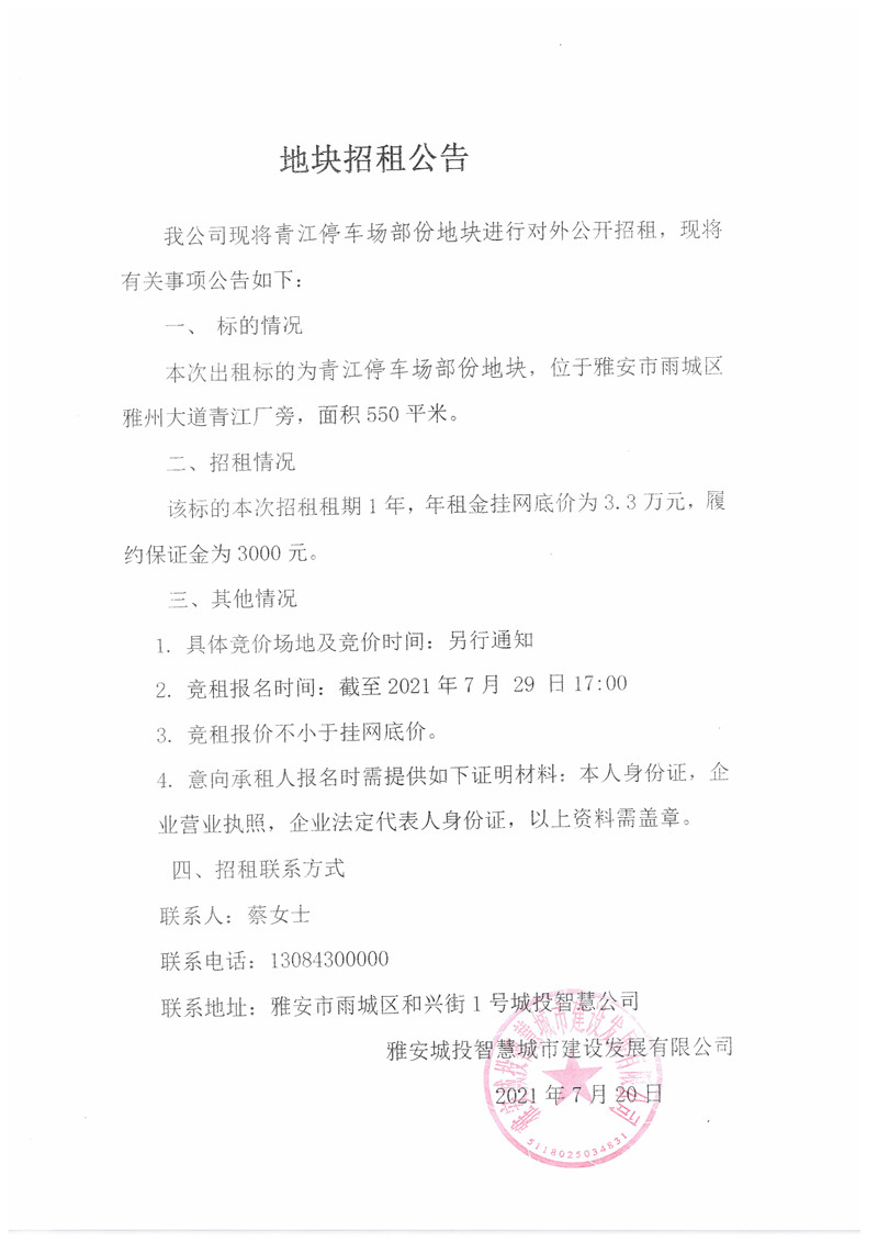 城投智慧公司青江停車場部分地塊招租公告(550㎡)
