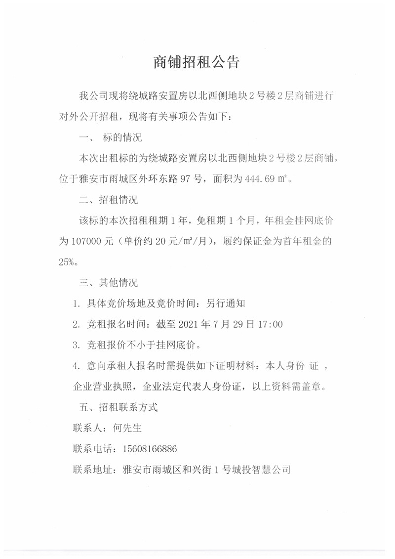 城投智慧公司繞城路安置房以北地塊2號樓2層商鋪招租公告