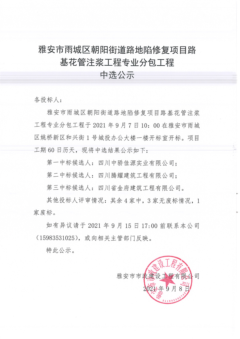 雅安市雨城區(qū)朝陽街道路地陷修復項目路基花管注漿工程專業(yè)分包工程中選公示