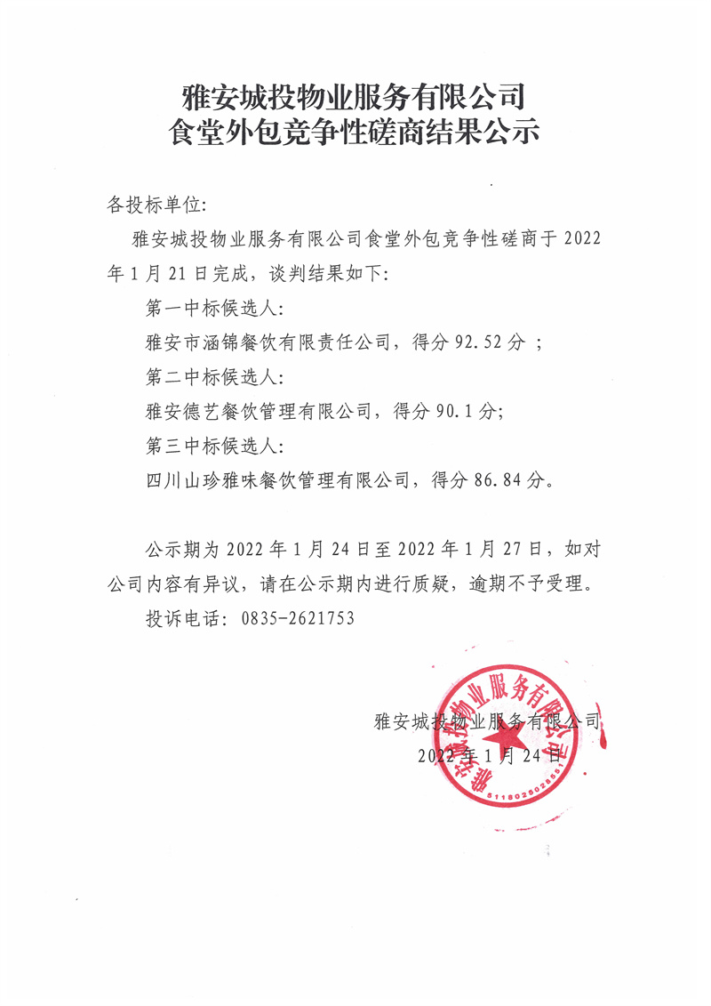 雅安城投物業(yè)服務(wù)有限公司食堂外包競爭性磋商結(jié)果公告
