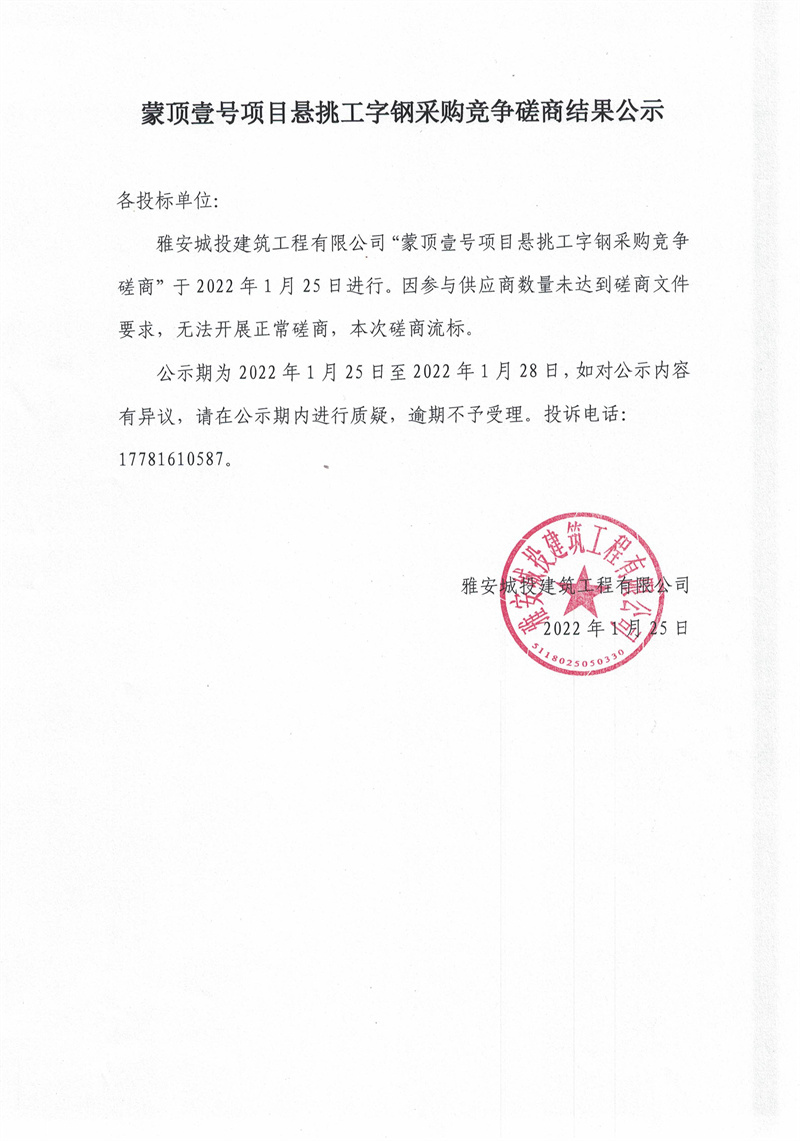 蒙頂壹號項目懸挑工字鋼采購競爭磋商結(jié)果公示