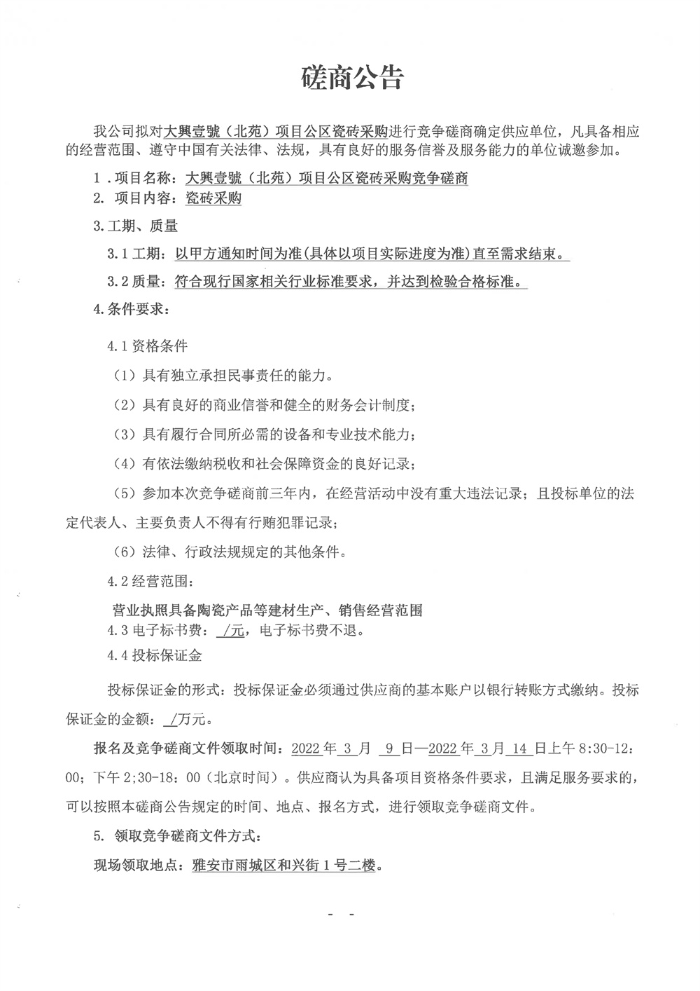 城投建工公司大興壹號(北苑)項(xiàng)目公區(qū)瓷磚采購競爭磋商公告