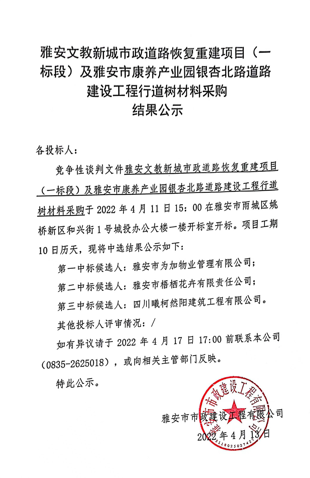 雅安文教新城市政道路恢復重建項目(一標段)及雅安市康養(yǎng)產業(yè)園銀杏北路道路建設工程行道樹材料采購結果公示