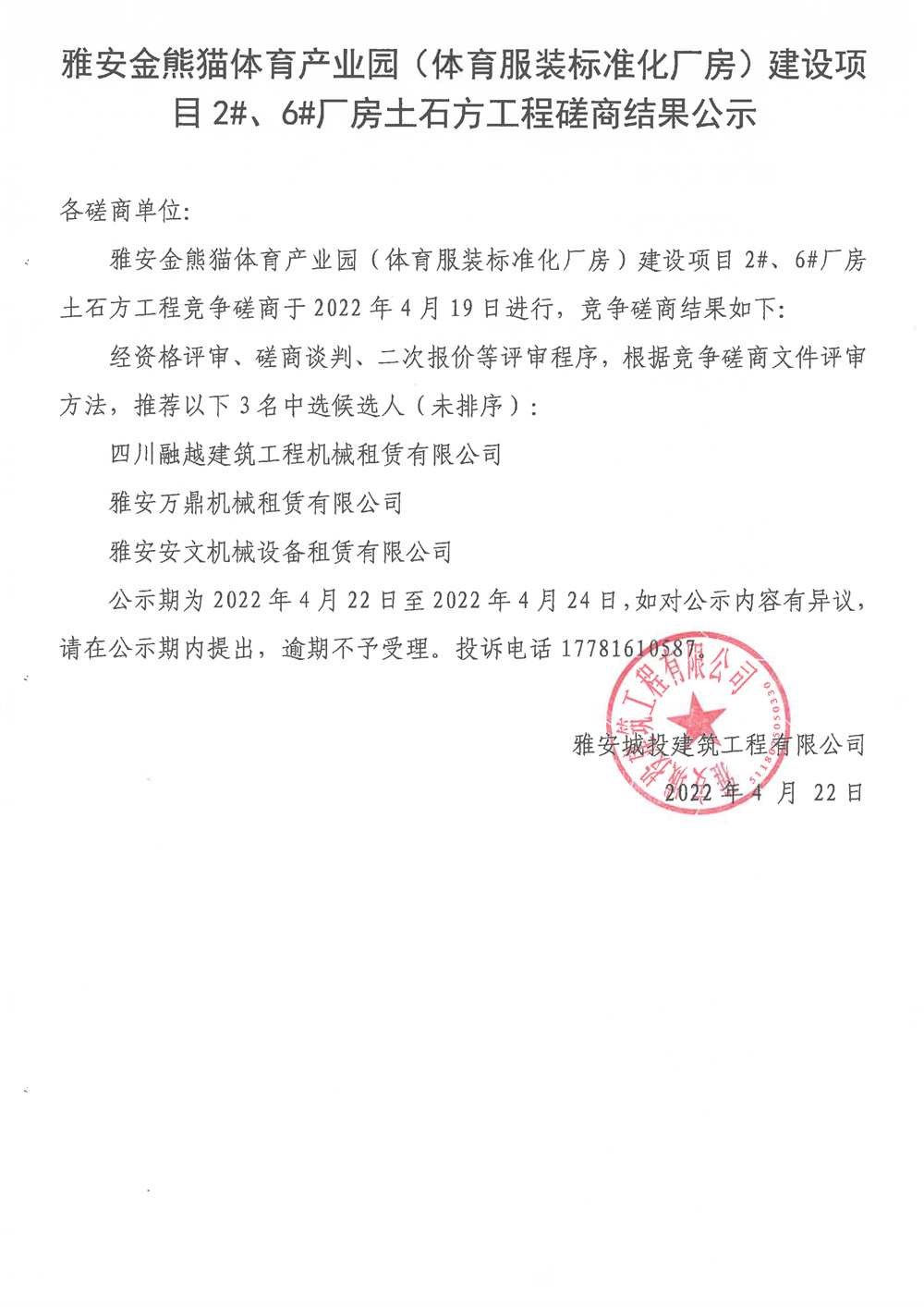 雅安金熊貓體育產(chǎn)業(yè)園(體育服裝標(biāo)準(zhǔn)化廠房)項(xiàng)目2#6#廠房土石方工程磋商結(jié)果公示