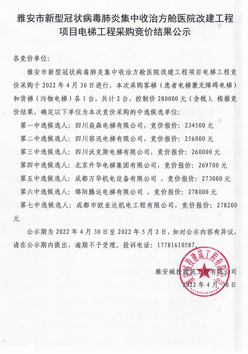 雅安市新型冠狀病毒肺炎集中收治方艙醫(yī)院改建工程項(xiàng)目電梯工程采購(gòu)競(jìng)價(jià)結(jié)果公示