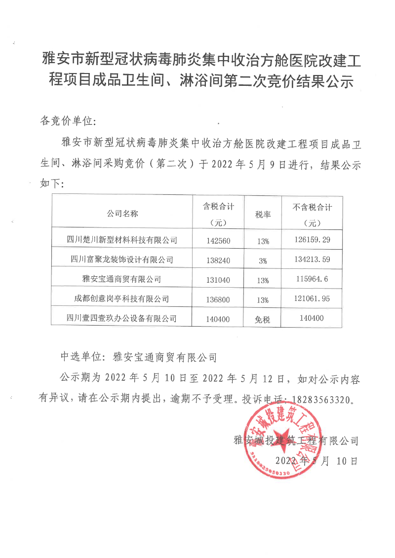 雅安市新型冠狀病毒肺炎集中收治方艙醫(yī)院改建工程項目成品衛(wèi)生間、淋浴間競價(第二次)結(jié)果公示