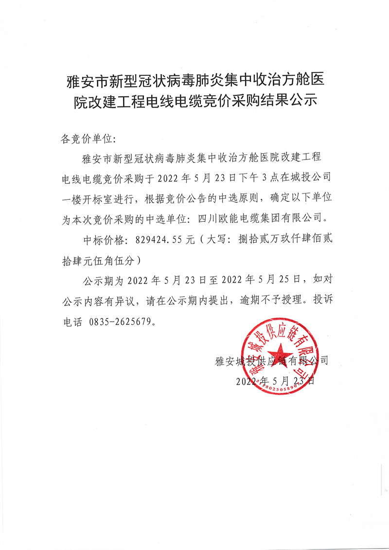 雅安市新型冠狀病毒肺炎集中收治方艙醫(yī)院改建工程電線電纜采購(gòu)競(jìng)價(jià)采購(gòu)結(jié)果公示