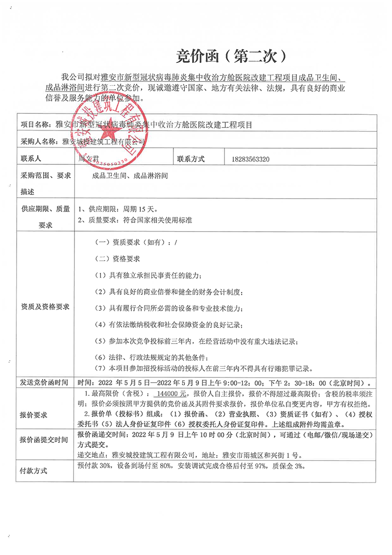 雅安市新型冠狀病毒肺炎集中收治方艙醫(yī)院改建工程項(xiàng)目成品衛(wèi)生間、淋浴間采購(gòu)競(jìng)價(jià)函(第二次)