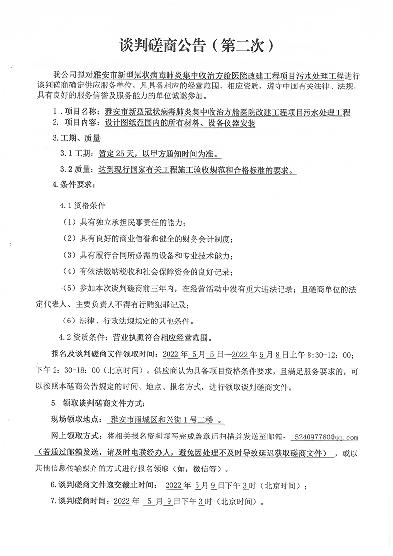 雅安市新型冠狀病毒肺炎集中收治方艙醫(yī)院改建工程項(xiàng)目污水處理工程談判磋商(第二次)