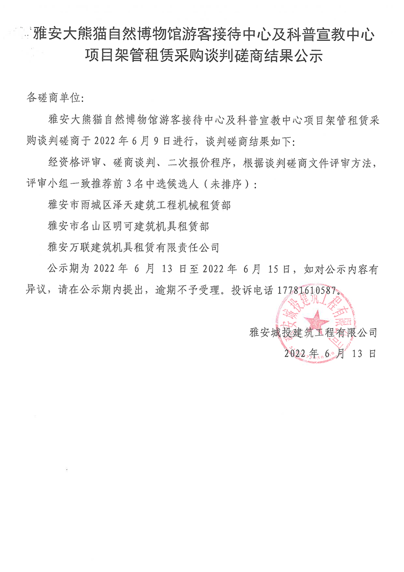 雅安大熊貓自然博物館旅游接待中心及科普宣教中心項目架管租賃談判磋商結(jié)果公示