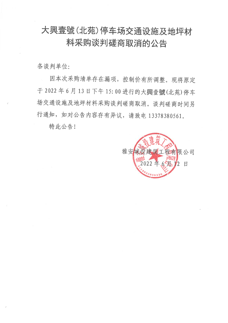大興壹號(hào)(北苑)停車場交通設(shè)施及地坪材料采購談判磋商取消的公告