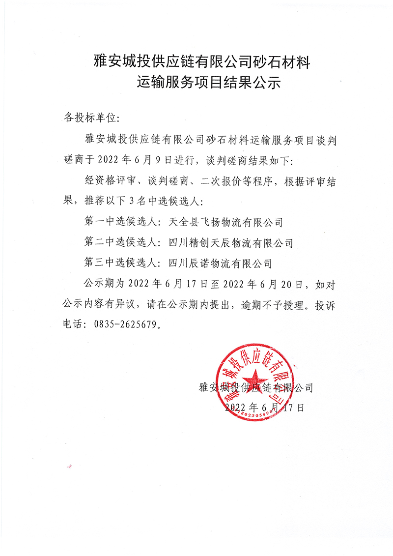 雅安城投供應(yīng)鏈有限公司砂石材料運(yùn)輸服務(wù)項(xiàng)目結(jié)果公示