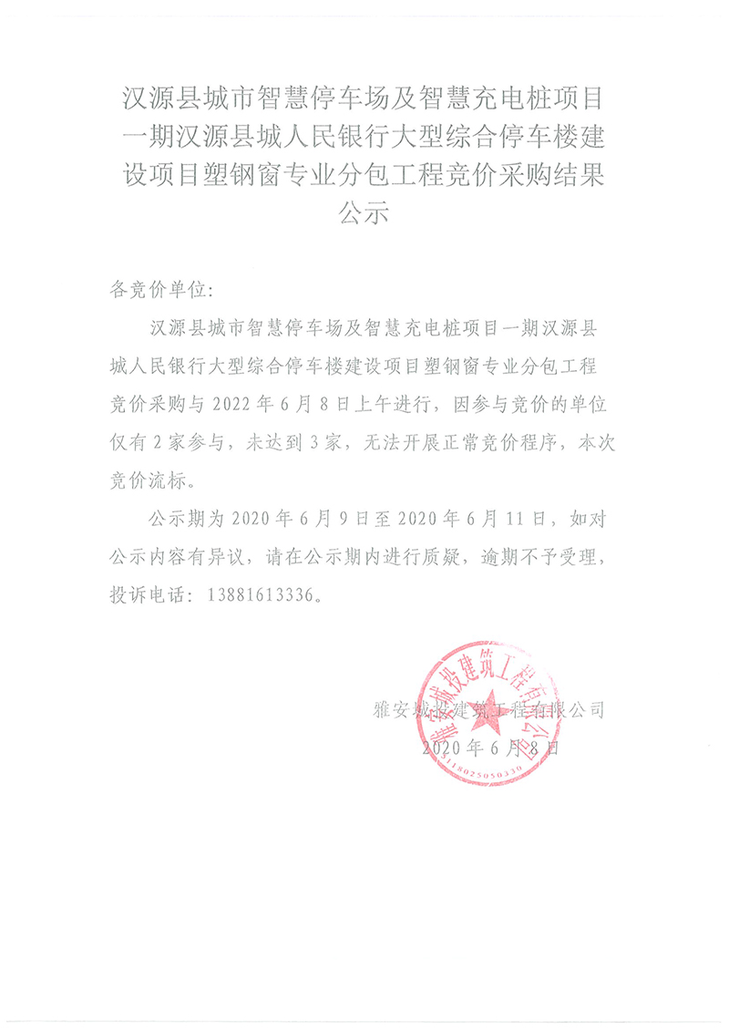 漢源縣城市智慧停車場及智慧充電樁項目一期漢源縣城人民銀行大型綜合樓停車樓建設(shè)項目塑鋼窗專業(yè)分包工程競價采購結(jié)果公示