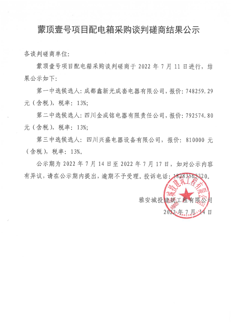 蒙頂壹號項目配電箱采購談判磋商結(jié)果公示