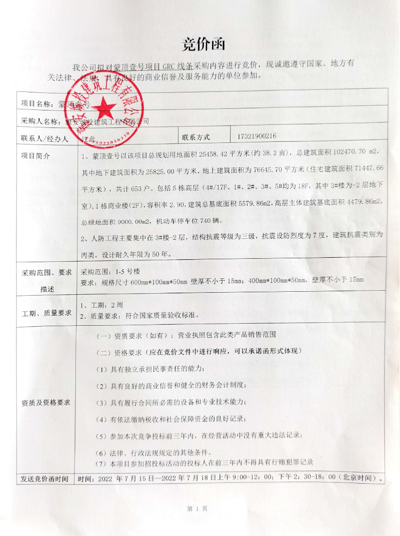 蒙頂壹號(hào)項(xiàng)目GRC線條采購(gòu)競(jìng)爭(zhēng)公告