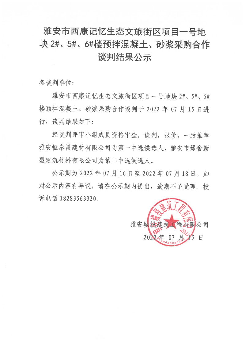 雅安市西康記憶生態(tài)文旅街區(qū)項(xiàng)目一號地塊2#、5#、6#樓預(yù)拌混凝土、砂漿采購合作談判結(jié)果公示