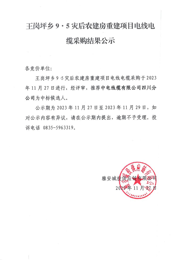 王崗坪鄉(xiāng)9·5災(zāi)后農(nóng)建房重建項(xiàng)目電線電纜采購(gòu)結(jié)果公示