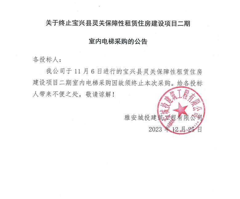關(guān)于終止寶興縣靈關(guān)保障性租賃住房建設(shè)項(xiàng)目二期室內(nèi)電梯采購(gòu)的公告