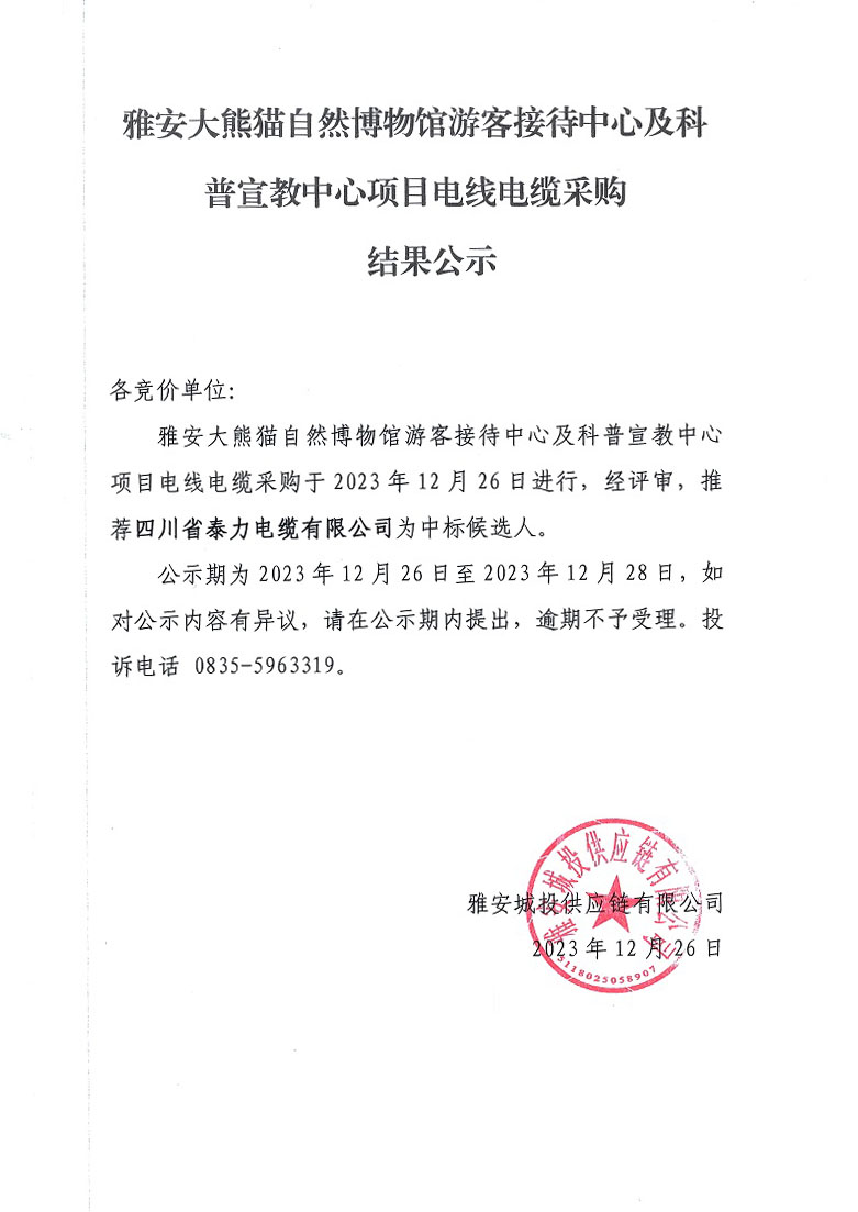 雅安大熊貓自然博物館游客接待中心及科普宣教中心項(xiàng)目電線電纜采購結(jié)果公示