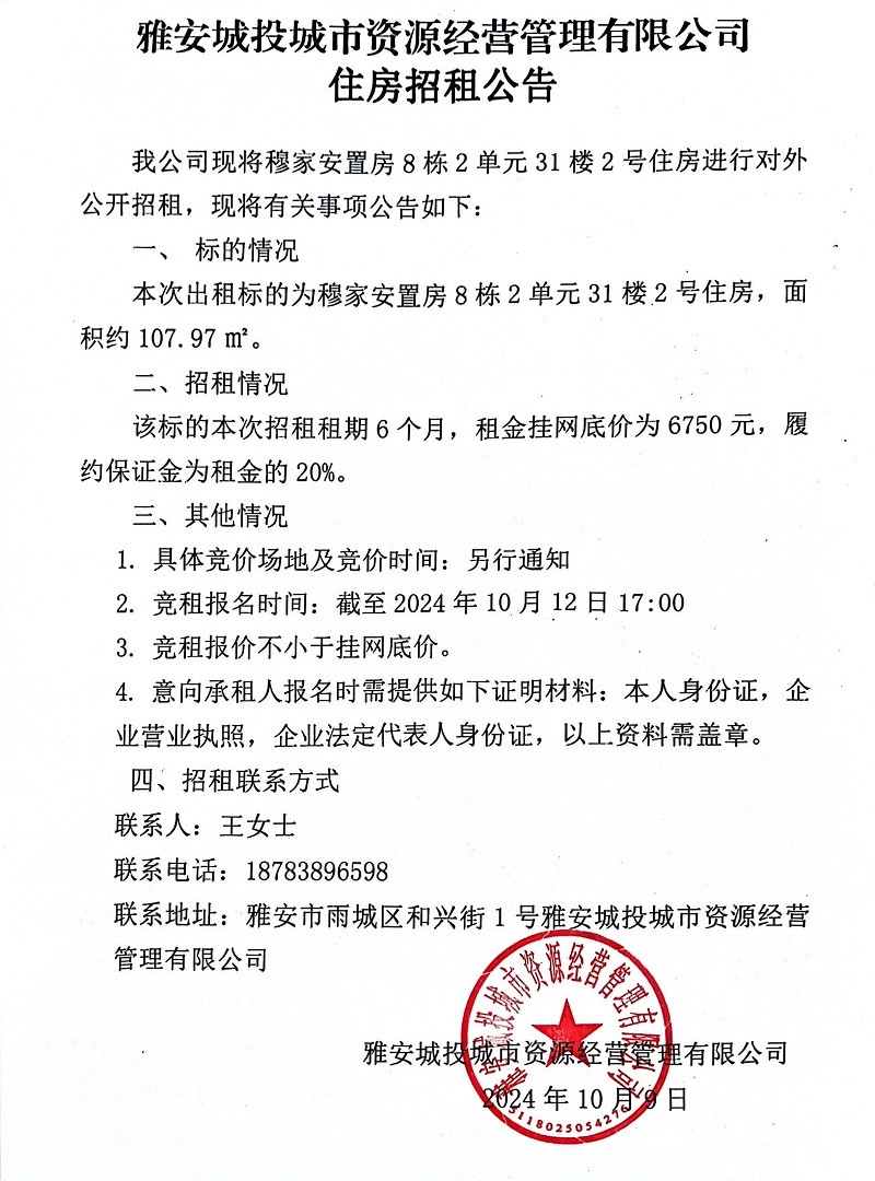 雅安城投城市資源經(jīng)營管理有限公司關(guān)于穆家安置房8棟2單元31樓2號住房招租公告