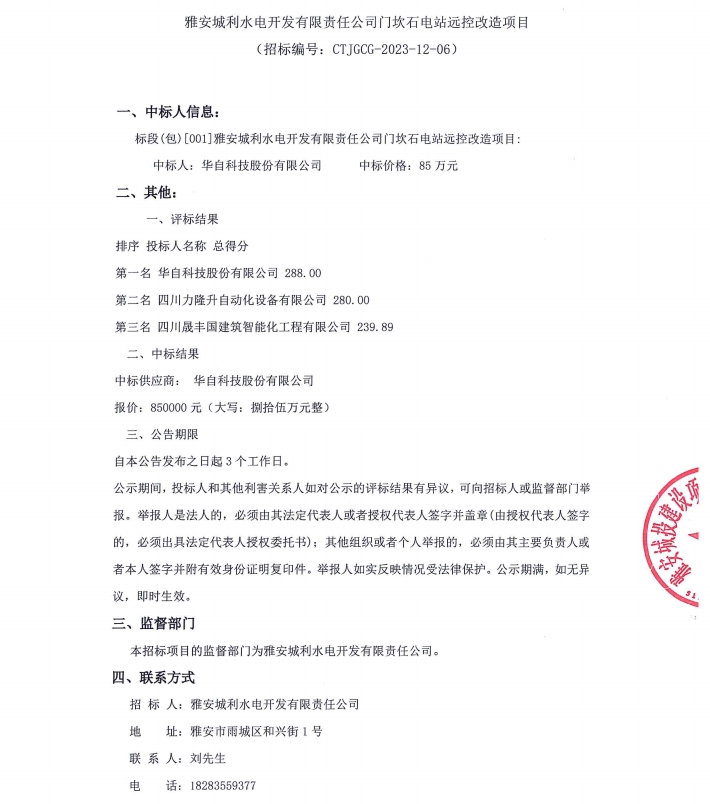 雅安城利水電開發(fā)有限責任公司門坎石電站遠控改造項目結果公示