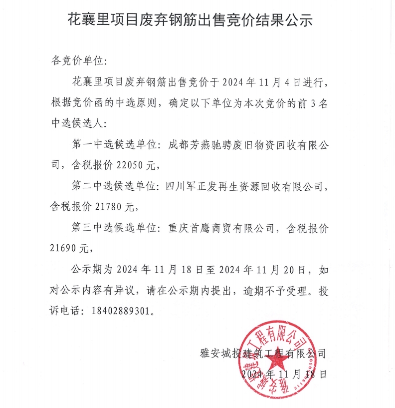 花襄·里項目廢棄鋼筋出售競價結果公示