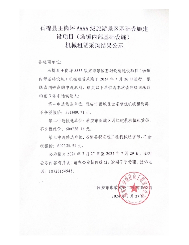 石棉縣王崗坪AAAA級(jí)旅游景區(qū)基礎(chǔ)設(shè)施建設(shè)項(xiàng)目(場(chǎng)鎮(zhèn)內(nèi)部基礎(chǔ)設(shè)施)機(jī)械租賃采購(gòu)結(jié)果公示