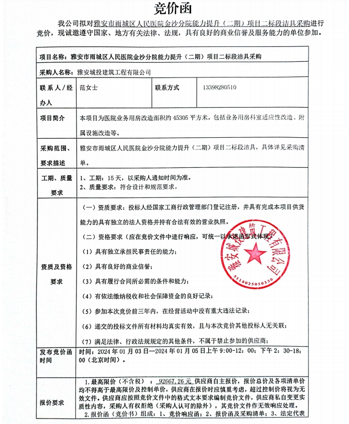 雅安市雨城區(qū)人民醫(yī)院金沙分院能力提升(二期)項(xiàng)目二標(biāo)段潔具采購(gòu)競(jìng)價(jià)公告